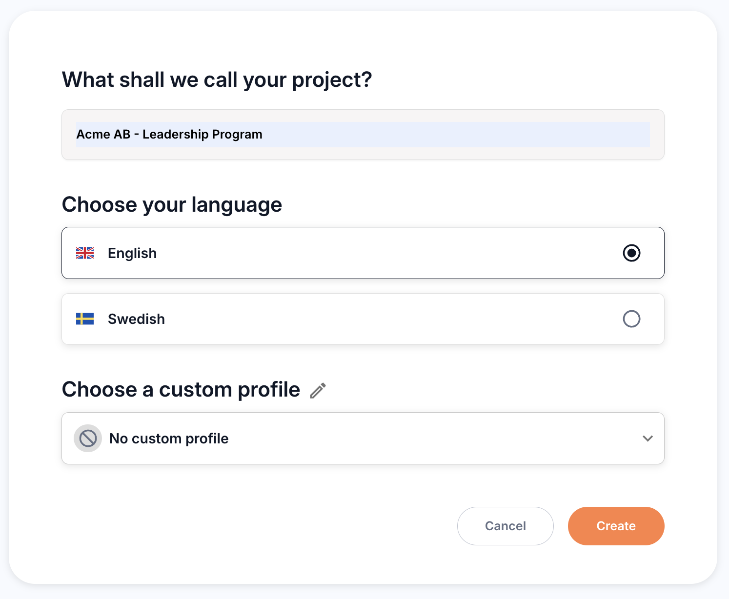 Open Tilda and start a new project. For this demo, we’re creating a leadership program for “Acme AB.” Select your working language — in this case, English — and proceed without a custom profile if you don’t yet have one defined (select one if you do).