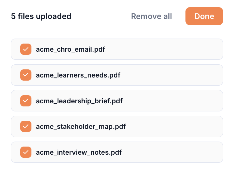 Gather and upload the core context materials: an email from your CHRO outlining metrics and goals, interview notes with your target audience, a leadership brief, and perhaps a stakeholder map. These help Tilda understand your environment and objectives before any design work begins.