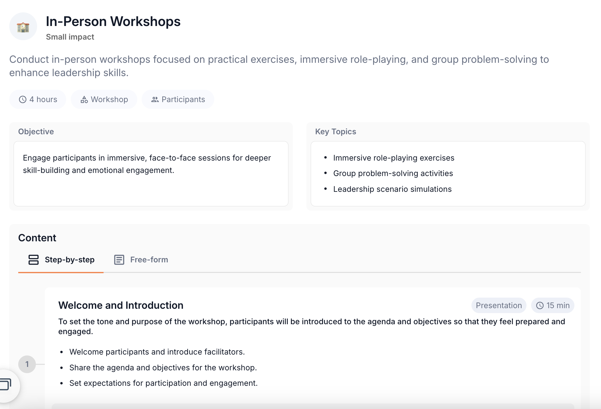 Now you can dig into your interventions and build in more detail. For example, the four-hour in-person workshop. You can provide some direction or go with Tilda's suggestions, to map out content and a flow for the session. Tilda works with you to provides objectives, key features, and suggested implementation steps. Adjust these as needed to reflect your audience’s context and constraints and of course your personal preferences as a learning designer.