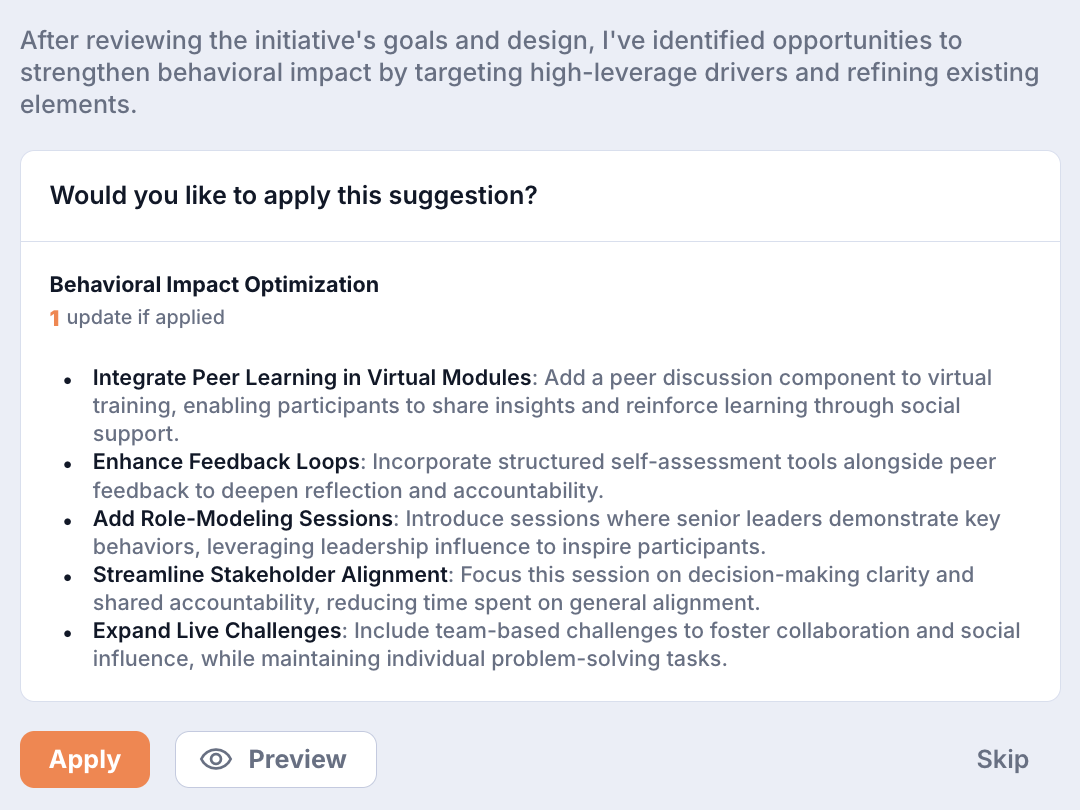 Tilda continually evaluates your design against research and evidence to give you a likelihood of the impact it will have on behavior. If your score is low you can explore improvement suggestions. In this case Tilda suggested doing more leadership role-modeling or improving the practicality of the live elements.
