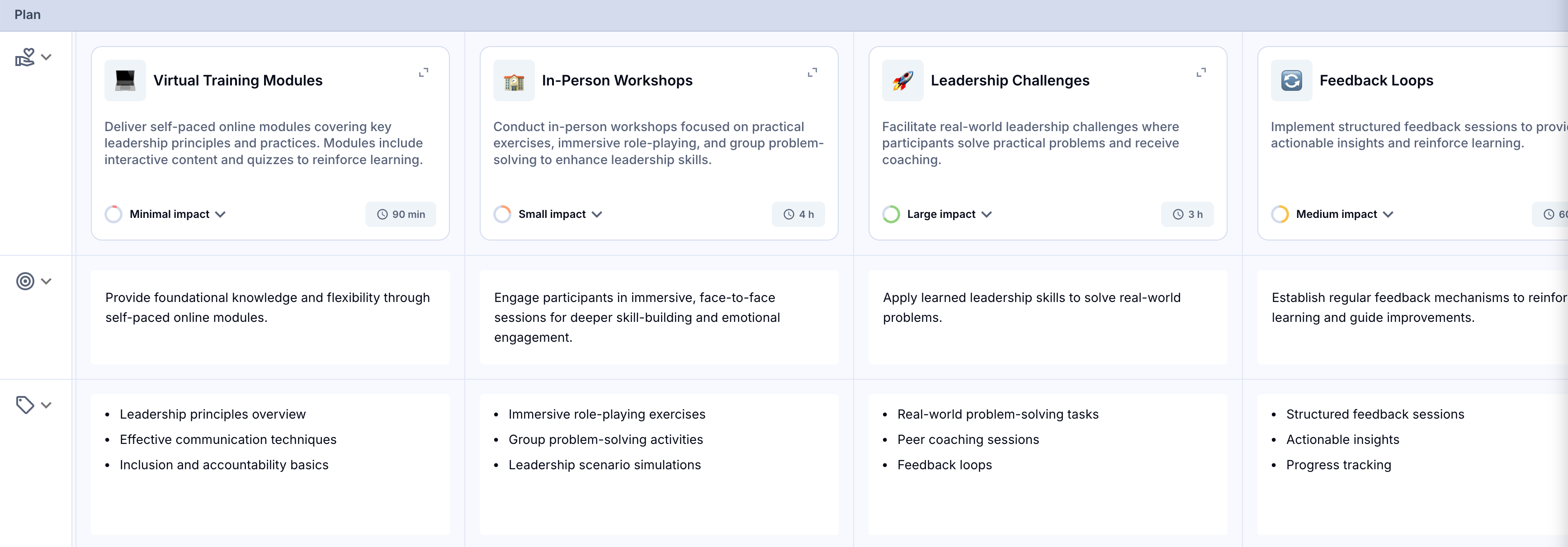 Once you have the brief in a good shape, you can start building your high-level learning journey. Use Tilda’s planning mode to map interventions out in sequence. In this example we built virtual training modules, in-person workshops, leadership challenges, and even feedback loops.