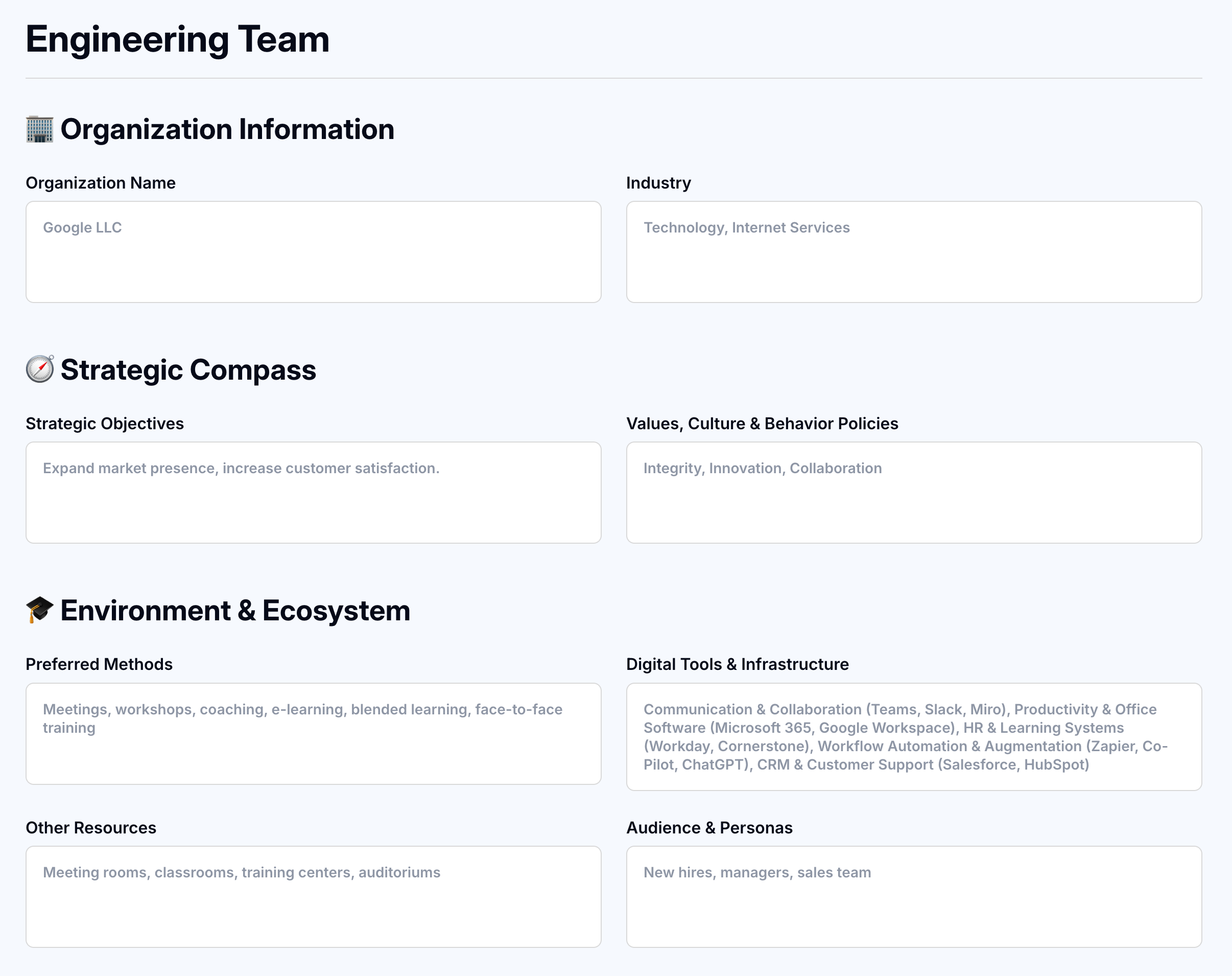 Open one up and you’ll see what a custom profile contains. At the top are the basics: organisation name and industry. Below that are the strategic objectives -what that team is trying to achieve - followed by values, culture & behavior policies, which set the tone for how they work and learn. The environment & ecosystem section has the biggest design impact. It describes the group’s preferred learning methods, the digital tools and platforms they have access to, and the other resources they can draw on. Finally, the audience and personas section captures who these people actually are: their roles, needs, and what they need to learn or change.